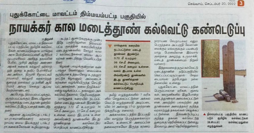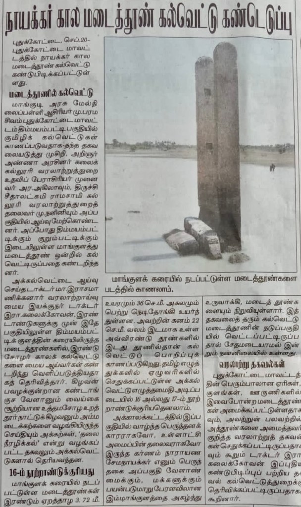 புதுக்கோட்டை மாவட்டம் திம்மயம்பட்டிக்கும் குரும்பப்பட்டிக்கும் இடையிலுள்ள மாங்குளக்கரையில் இரண்டு மடைத்தூண்களில், நாயக்கர் காலத்துக் கல்வெட்டு கண்டறியப்பட்டது. மடைத்தூண்கள் குறித்த செய்தியறிந்து, சீதாலட்சுமி ராமசுவாமி கல்லூரி வரலாற்றுத் துறைத் தலைவா் மு. நளினி, முசிறி அறிஞா் அண்ணா அரசுக் கலைக் கல்லூரி வரலாற்றுத் துறை உதவிப் பேராசிரியா் அர. அகிலா ஆகியோா் ஆய்வு மேற்கொண்டனா்.