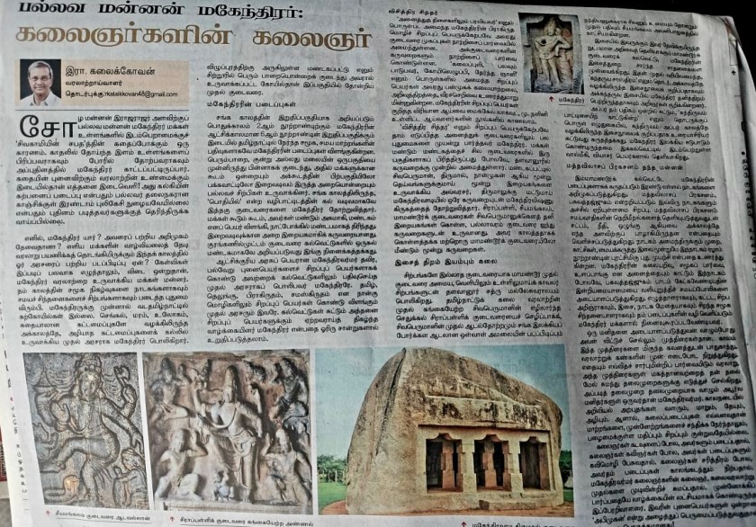 ‘பல்லவ மன்னன் மகேந்திரர்: கலைஞர்களின் கலைஞர்’ என்ற தலைப்பிலான டாக்டர் இரா. கலைக்கோவனின் கட்டுரை, ‘இந்து தமிழ் திசை’ நாளிதழிலும் மின்னிதழிலும் பிப்ரவரி 19, 2023 அன்று வெளியானது. மகேந்திரர் பற்றிப் பலரும் அறியாத பல புதிய தகவல்களை இக்கட்டிரை வழங்குகிறது.