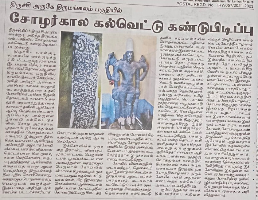 அங்கு கண்டுபிடிக்கப்பட்ட முதலாம் குலோத்துங்கச்சோழா் காலத்தைச் சேர்ந்த இரண்டு புதிய கல்வெட்டுகளில், அயோத்தி ஆழ்வார் கோயில் என்ற புதிய கோயில் பற்றிய குறிப்புகள் கிட்டின. அதனைத் தொடர்ந்து, அயோத்தி ஆழ்வார் கோயிலைத் தேடும் அடுத்தக்கட்ட கள ஆய்வு தொடங்கியது. திருமங்கலத்தில் வரதராஜப் பெருமாள் பெயரால் விளங்கும் இன்றைய கோயிலைக் கண்டறிந்து அங்கு ஆய்வு செய்தபோது, மற்றுமொரு புதிய கல்வெட்டு கிடைத்தது. அக்கல்வெட்டு, கோயிலின் ஒரு பகுதியை ‘திருஅயோத்தி எம்பெரிமான் திருமுற்றம்’ என்று சுட்டியது வினாக்களுக்கு விடையளிக்குமாறு அமைந்தது.