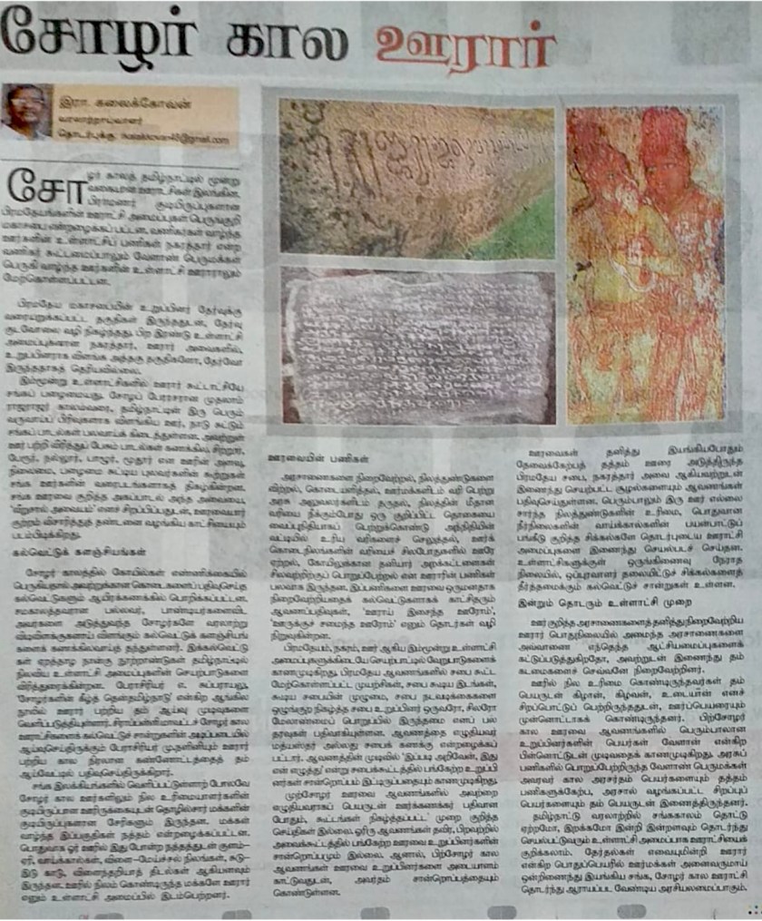 ‘இந்து தமிழ் திசை’ நாளிதழிலும் மின்னிதழிலும் ஏப்ரல் 09, 2023 அன்று வெளியான டாக்டர் இரா. கலைக்கோவனின் ‘சோழர் கால ஊரார்’ என்ற தலைப்பிலான கட்டுரை- ஊரவைகளின் பணிகள், அவை தனித்து இயங்கியபோதும் தேவைக்கேற்பத் தத்தம் ஊரை அடுத்திருந்த பிரமதேய சபை, நகரத்தார் அவையுடன் இணைந்து செயற்பட்டச் சூழல், ஊரில் நில உரிமை கொண்டிருந்தவர்கள் தம் பெயருடன் இணைத்துக் கொண்ட சிறப்பொட்டுக்கள் போன்ற சுவையான பலச் செய்திகளை விளக்குகிறது.