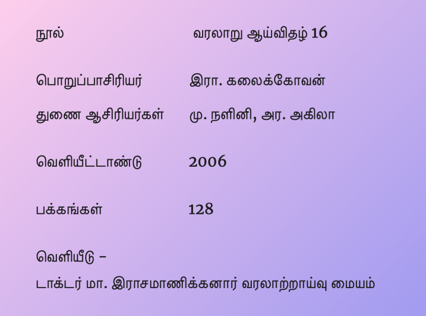 இந்த இதழுடன், ‘வரலாற்றின் வரலாறு’ இணைப்பாகத் தரப்பட்டுள்ளது. டாக்டர் மா. இராசமாணிக்கனாரின் நூற்றாண்டு கொண்டாடப்படும் இந்நல்லோரையில் அப்பெருந்தகையின் பாடுகளை நூலாக்கித் தரமுடிந்திருப்பதற்காகப் பெரிதும் உவக்கிறோம்.