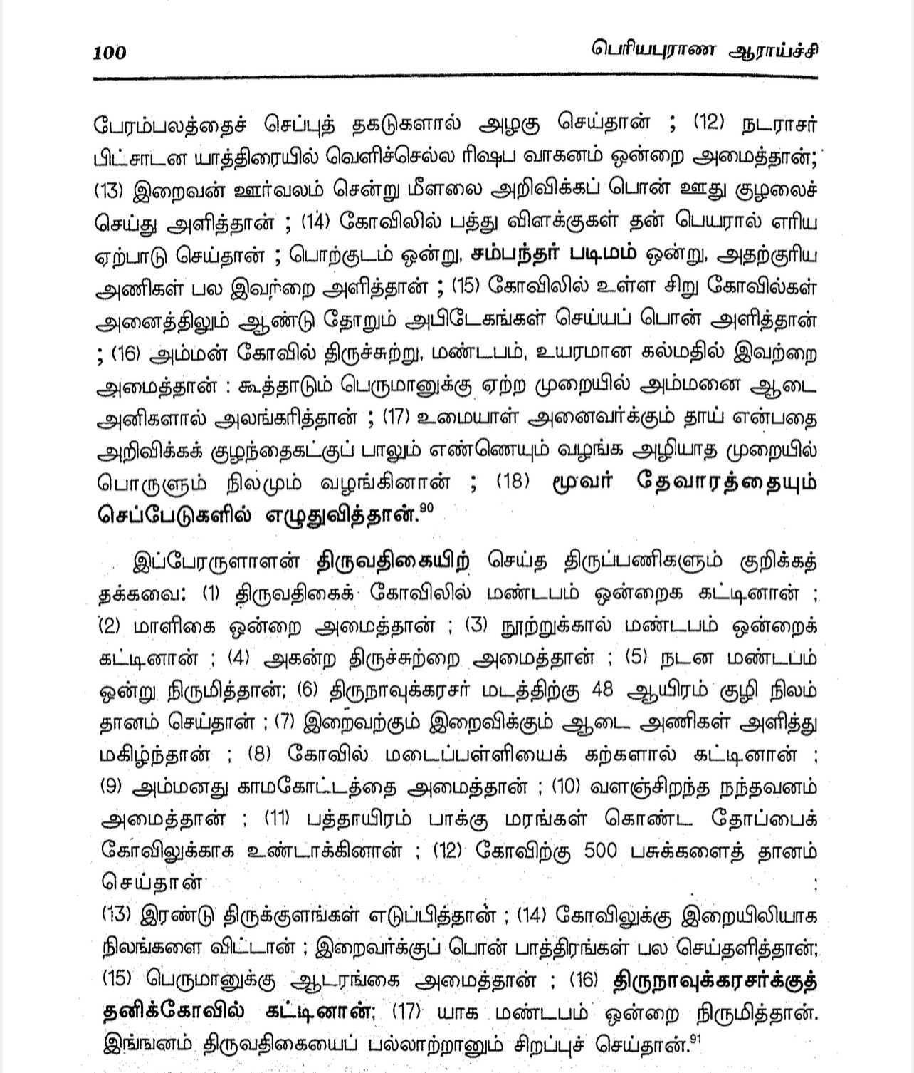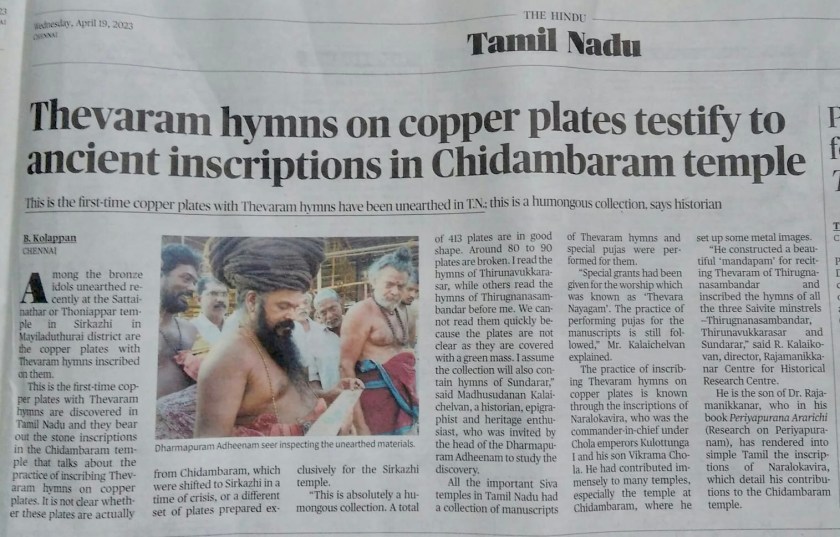 “தேவாரப் பண்களைச் செப்பேடுகளில் எழுதுவது வழக்கில் இருந்ததை முதலாம் குலோத்துங்கன் மற்றும் அவன் மகன் விக்கிரமச் சோழன் ஆட்சிக் காலங்களில் படைத்தலைவனாக இருந்த நரலோக வீரன் கல்வெட்டுகளிலிருந்து அறியமுடிகிறது. சிதம்பரம் கோயிலுக்குச் செப்புத் திருமேனிகள் வழங்கியும், திருஞானசம்பந்தரின் தேவாரப் பண்கள் பாடுவதற்கென அழகியதோர் மண்டபம் அமைத்தும் கோயில் திருப்பணிகள் செய்த நரலோக வீரன், திருஞானசம்பந்தர், திருநாவுக்கரசர், சுந்தரர் பண்களைச் செப்பேடுகளில் பதிக்கச் செய்தான்,” என்று தெரிவித்தார்.