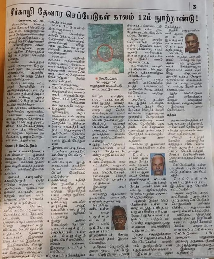 திருத்தோணிபுரம் என்று பத்திமை இலக்கியங்கள் குறிப்பிடும் சீர்காழியில் சமீபத்தில் தேவாரப் பாடல்கள் பொறிக்கப்பட்டச் செப்பேடுகள் கண்டெடுக்கப்பட்டன. இது குறித்து டாக்டர் இரா. கலைக்கோவன் கருத்து தெரிவிக்கையில்-