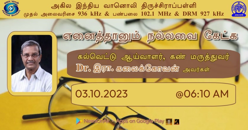 திருச்சிராப்பள்ளி வானொலி நிலையத்தின் ‘எனைத்தானும் நல்லவை கேட்க நிகழ்ச்சியைத் தொடர்ப் பொழிவாக 02.07.24 செவ்வாய்முதல் டாக்டர் இரா. கலைக்கோவன் வழங்கி வருகிறார். செவிவழி வரும் செய்திகளை அறிவுக்கான உணவு என்று அறிஞர்கள் கூறுவதைச் சுட்டி, அந்த அறிவை நெறிசார்ந்து வாழ்ந்தவர்கள் வாழ்க்கைவழி கேட்போர் பெற்றிட தம் பொழிவால் உதவுகிறார். அவ்வகையில், வையத்துள் வாழ்வாங்கு வாழ்ந்து வரலாறான பெருமக்களையும் அவர்தம் சீரிய பணிகளையும் சுவைமிகு செய்திகளாக நற்றமிழில் கேட்டு மகிழலாம்.