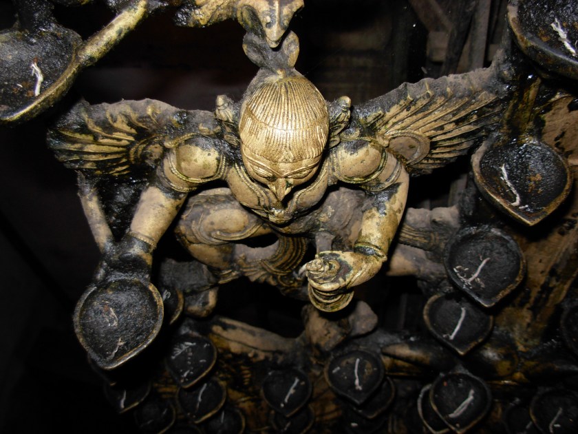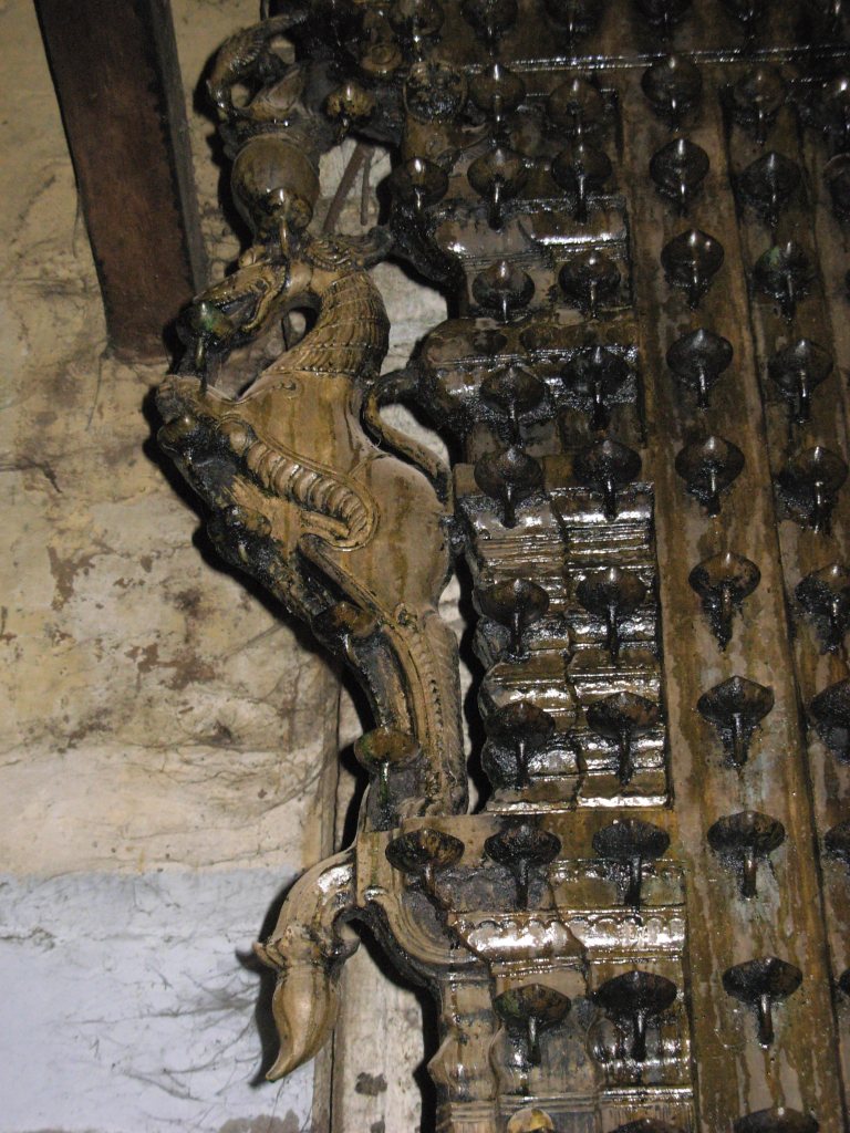இந்தக் காவலர் மீது வளரும் அகல் அடுக்குகள் பிறைநிலவாய் வளைந்து உச்சியில் கீர்த்திமுகம் கொண்டு முடிகின்றன. கீர்த்திமுக வாயிலிருந்து வெளிப்படும் தீச்சுடர்கள் மகரங்களாக, பிறைவளைவில் கொடிக்கருக்குகள் தழுவிய தாவுயாளிகள். பக்கத்திற்குப் பதின்மூன்றாய் வளரும் அந்த யாளிகளும் அகல் தாங்கிகள்தான் வாருணி. தூண்கள் பிறையென வளையுமிடத்துப் பதக்கமாலையுடன் ஒரு கையில் அகலும் ஒரு கையில் மணியுமாய்ப் பக்கத்திற்கொரு வானவர்.