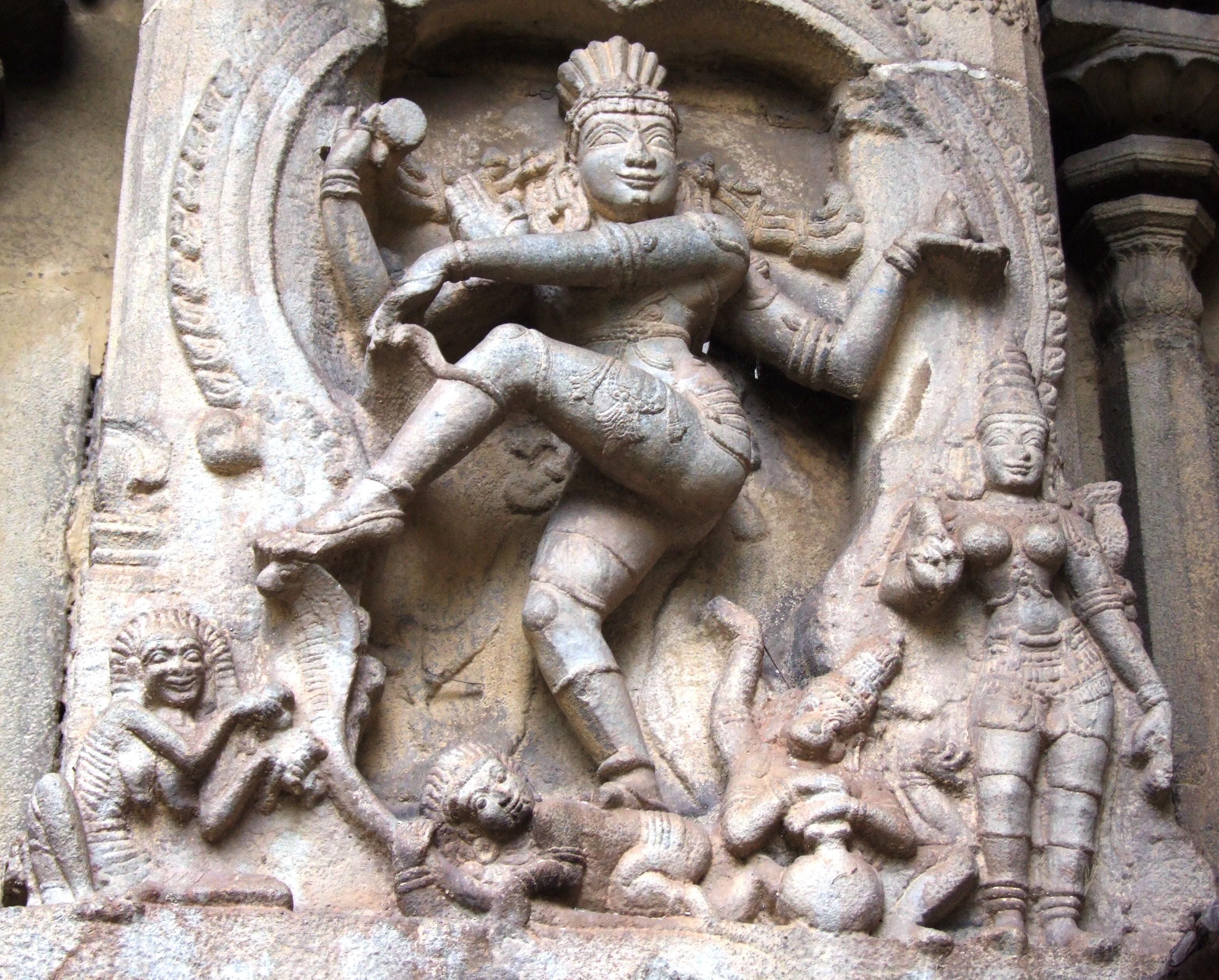 முதலில் ஆனந்ததாண்டவச் சிற்பங்களைப் பார்ப்போம் வாருணி. இரண்டு இடங்களில் இவை உள்ளன. இரண்டு தூண்களுக்கு இடைப்பட்ட சுவரில் மகரதிருவாசிக்கு நடுவில் வலக்காலை முயலகன் முதுகின் மீதும் உயர்த்தி வீசிய இடக்காலை அம்முயலகன் கையிலிருந்து சீறி வளர்ந்தோங்கி படம் விரித்திருக்கும் பாம்பின் மீதும் இருத்தி ஆனந்த நடமிடும் இறைவனின் இடமுழங்காலை மற்றொரு பாம்பு சுற்றிப் படமெடுத்துள்ளது. அதன் தலை தொட்டவாறே இறைவனின் இட முன் கை வேழக்கையாக வீசப்பட்டுள்ளது. பின்கைகளில் துடியும் தீயகலும் அமைய, வல முன் கையோ காக்கும் குறிப்பில்.